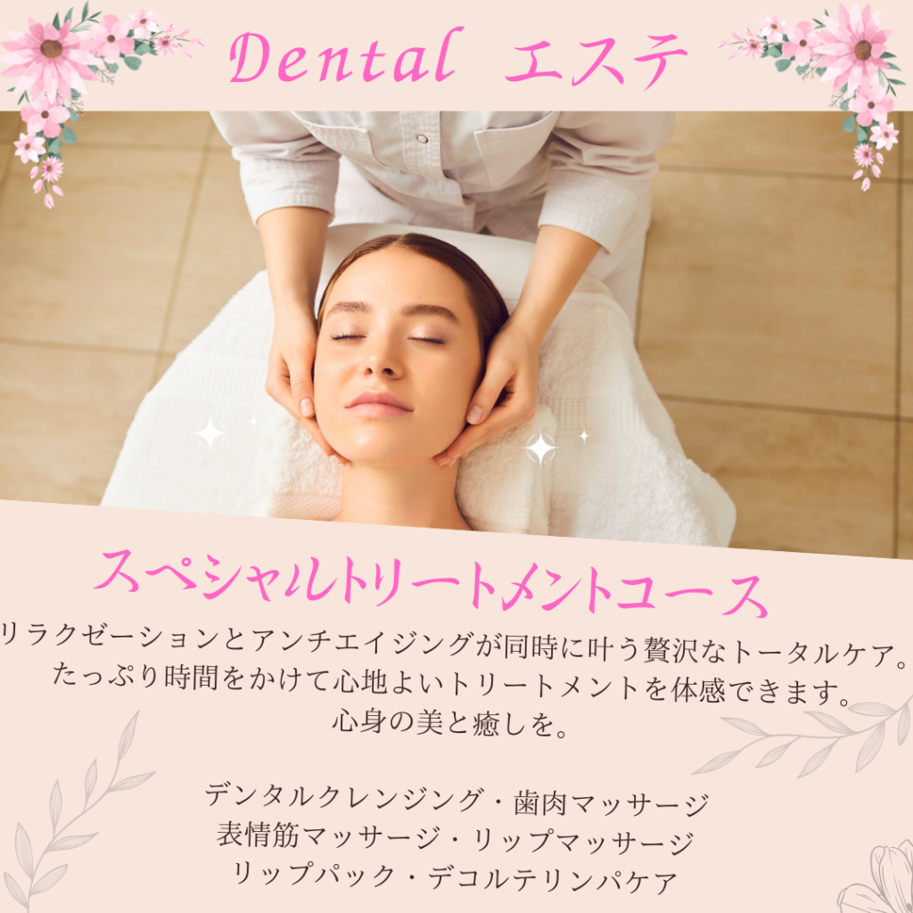 当院のデンタルエステは、歯科医療の知見を基盤に、リラクゼーションとアンチエイジングを同時に叶えるトータルケアメニューです。