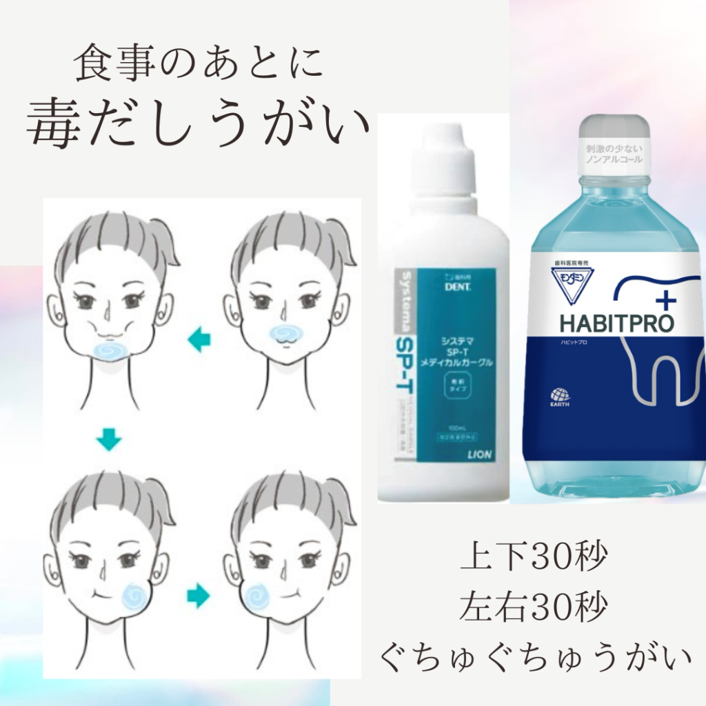食後すぐに、殺菌効果のあるうがい薬を使って上下30秒・左右30秒ぐちゅぐちゅうがいを行うことで、口腔内の汚れや細菌をしっかりと洗い流し、歯ぐきや歯の健康を守ります✨
